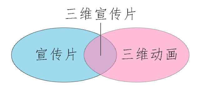 然而,三維動(dòng)畫(huà)技術(shù)也不僅僅運(yùn)用于宣傳片制作領(lǐng)域,譬如當(dāng)下很多CG電影、3D游戲,當(dāng)中都運(yùn)用到三維動(dòng)畫(huà)技術(shù);下面我們用一張圖,可以表達(dá)出它們兩者之間的關(guān)系: